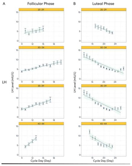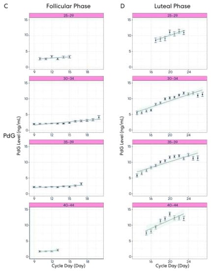 Furthermore, because we decided to exclude cycle days for which we had fewer than 100 samples, our analysis of the 25–29-year-old age group and the 40–44-year-old age group were limited. Initial findings suggest that mean hormone levels of the 25–29-year-old group were lower than the means for older age groups. This finding is contrary to what would be expected among the younger demographic and warrants additional analysis with a larger sample size.