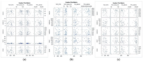 Scatter plot analysis illustrating the relationship between fixation metrics and psychological assessment results at baseline evaluation (a) Baseline visit; (b) Visit 2; (c) Visit 3.