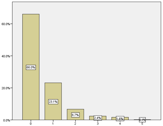 The average number of previous miscarriages in our sample population was 0.51, with a standard deviation of 0.867. As we can see in Table 2 and Figure 1, in the sample, 66% of the women in our study had no history of previous miscarriages, while 44% had previous pregnancy losses. Among the latter, 23% had one previous spontaneous abortion, while the remaining 10.8% had more than one.