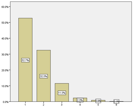 In Table 4, we can see the summary of visits to the emergency room. The largest group of patients, who accounted for 52.7% and 32.5% of visits, attended the emergency room on one and two occasions, respectively; this group totals 85.2%. The remaining 14.8% of the patients visited the emergency department more than twice (Figure 3).