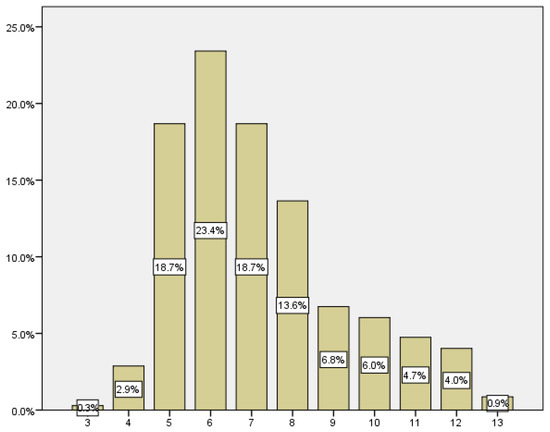 The mean gestational age (number of weeks) at which the first consultation took place was 7.19 weeks, with a standard deviation of ±2.069. The highest percentage of women who consulted for first trimester bleeding (23.4%) did so in the 6th week of amenorrhea. The most part of the consultations occurred between the 5th and 8th week of gestation, constituting 74.4% of the consultations (Table 5) (Figure 6).