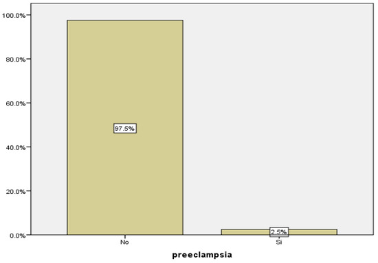 As previously stated, we define preeclampsia as hypertension that appears after 20 weeks of gestation accompanied by proteinuria. In our study, we recorded data from 243 pregnant women, 6 of whom were diagnosed with preeclampsia, corresponding to 2.5% of them (Figure 9).