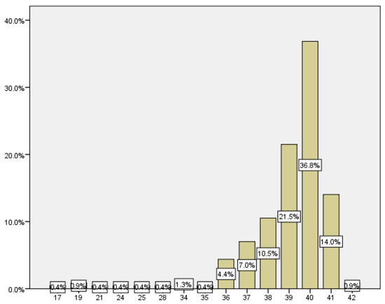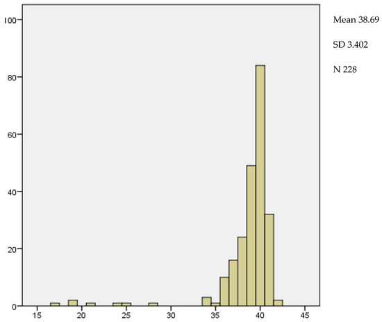 Gestational age at delivery ranged from 17 weeks, which corresponded to a late abortion, to 42 weeks, being 38.69 weeks with a SD of ±3.4 weeks mean gestational age at delivery (Figure 10).