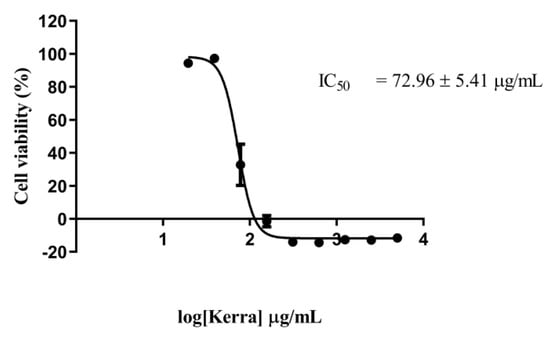 Cytotoxicity effect of Kerra™ extract against HCT116 cells after 72 h of exposure using MTT assay at the concentration ranging from 5 to 0.020 mg/mL in logarithmic scale.