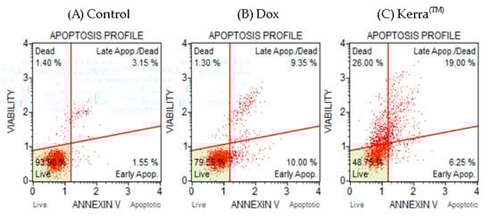 Flow cytometry was used to determine the apoptotic potential of the Kerra™ extract, allowing the identification of healthy, early apoptotic, late apoptotic, and death cells. To investigate the apoptotic effect, the cells were treated with the IC50 concentration of the Kerra™ extract (73 μg/mL). The cell population profiles after treatments with the negative control (0.1% DMSO), positive control (0.059 μM Dox), and Kerra™ extract (73 μg/mL) are shown in Figure 2A, 2B, and 2C, respectively.