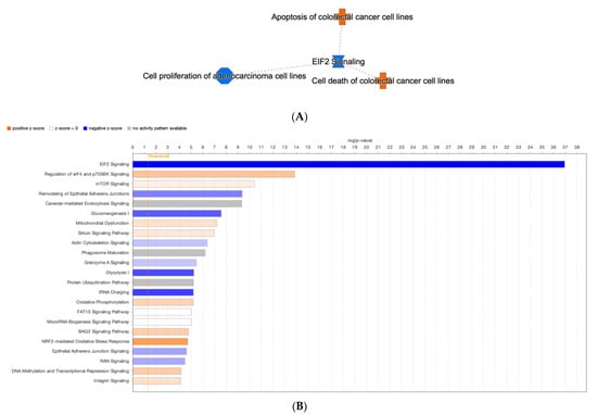 The IPA analysis revealed the identification of canonical pathways. (A) A network containing a compilation of the most significant results derived from IPA analysis (B) The threshold levels are indicated by the horizontal line. A negative z-score indicates pathway inhibition, while a positive z-score indicates pathway activation. White (transparent) bars signify “no activity” within the pathway.