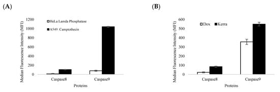 For confirmation of the apoptotic-related protein expression of the Kerra™-extract-induced apoptotic event, we used the immuno-based Luminex® assay, which allows the simultaneous detection of two apoptotic-related proteins that are markers of the apoptotic signaling pathways. These were caspase-8 (Asp384) and caspase-9 (Asp315). We used HeLa cells treated with lamda phosphatase as the negative control (unstimulated cells) and A549 cells treated with 5 µM of camptothecin as the positive control (apoptotic cells). The results showed that the all-apoptotic marker proteins in the positive control were in significantly higher abundance than the negative control by more than 100-fold (Figure 5A). These findings confirm that the immuno-based Luminex® assay can be used to quantify the apoptotic proteins in our experiment.