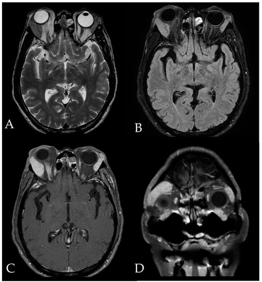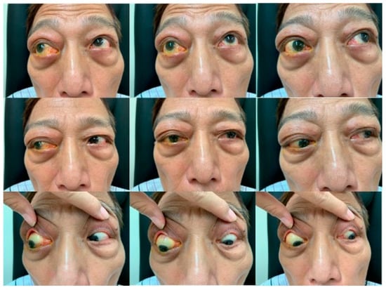 In 2020, a year later, the patient reported ocular irritation, blurred vision, progressive swelling of the right upper eyelid, and proptosis of the right eye without fever, night sweats, and weight loss. The best-corrected visual acuity was 20/25 and 20/32 in the right and left eye, respectively. Hypotropia and head tilt to the right with mild limitation in the abduction of the right eye were noticed (Figure 1). A painless, well-defined, non-movable palpable soft mass was noted on the right upper eyelid. Serology tests revealed an elevated erythrocyte sedimentation rate and IgG-4 level. Levels of serum kappa and lambda-free light chains were also increased. HHV-8, Epstein–Barr virus, and Human Immunodeficiency Virus testing were negative. Magnetic resonance imaging (MRI) revealed soft tissue lesions involving bilateral lacrimal glands, suggesting an orbital lymphoproliferative disease (Figure 2).