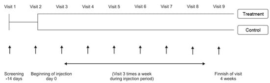 This clinical trial is a multicenter, randomized, double-blind, parallel-group, and comparative study designed to evaluate the effects and safety of Unicenta in comparison to Melsmon injections for improving symptoms of menopausal disorders. The visit frequency and follow-up period were as shown in Figure 1.