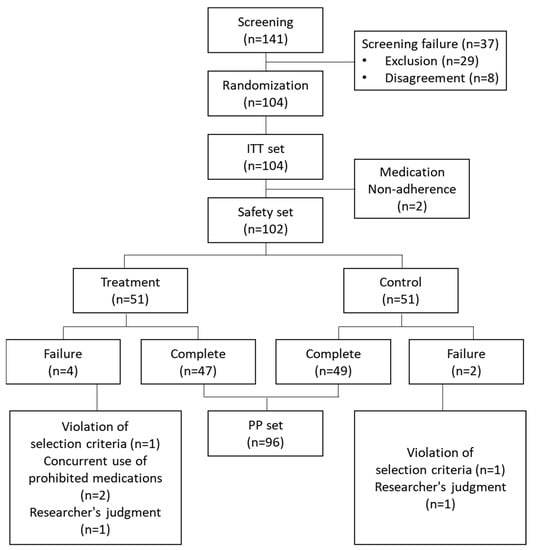 After randomization, the participants were classified into the safety analysis group, ITT analysis group, and PP analysis group based on the application of the investigational drug and the primary efficacy evaluation. The distribution of participants, along with the number of participants, is presented in Figure 2. A total of 141 participants underwent screening, and 104 participants were registered for the application of the investigational drug. Thus, a total of 104 participants were included in the ITT analysis group, and among them, 96 participants completed the trial without major protocol violations, forming the PP analysis group.