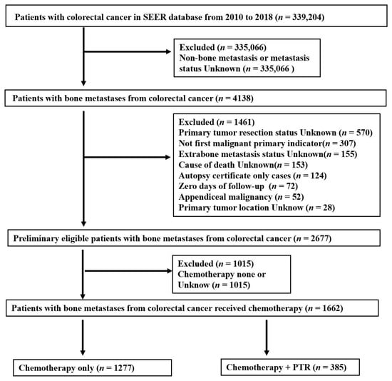 Flow diagram illustrating the selection process of eligible colorectal cancer (CRC) patients with bone metastasis (BM) from the SEER database, categorized into two groups: Chemotherapy alone and chemotherapy combined with primary tumor resection (Chemotherapy + PTR). The figure depicts the sequential steps of patient inclusion and exclusion based on specific criteria, leading to the final study cohorts for each group.