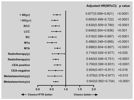 The adjusted hazard ratios (HRs) for cancer-specific survival (CSS) were calculated from a comprehensive subgroup analysis, encompassing multiple parameters, including age, location of the primary tumor, M stage, radiotherapy, CEA level, and metastasectomy. The analysis revealed that in all subgroups, the Chemotherapy + PTR group achieved a survival advantage compared to the Chemotherapy alone group.