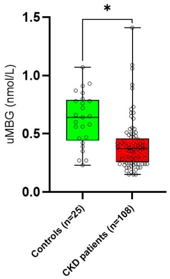 Therefore, with this information in mind, we have designed a pilot, cross-sectional, proof-of-concept study for the first time to evaluate the possible clinical significance of uMBG measurement in a small cohort of individuals with non-advanced CKD in relation to the severity of renal impairment, the presence of co-morbidities and other clinical factors that could impact the MBG balance.