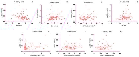 Univariate correlations between uMBG (nmol/L) and age (A), BMI (B), CKD-Epi eGFR (C), hemoglobin (Hb) (D), proteinuria (E), urinary potassium (F) and urinary sodium (G). All Pearson correlation coefficients and p values are referred to analyses employing log-transformed uMBG values.