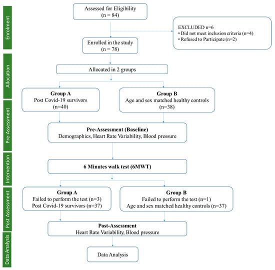 Eighty-four male participants were screened based on inclusion criteria for allocation into the post-COVID-19 and healthy control groups. Six participants dropped out during the initial screening, further leaving 78 participants, which were allocated to the post-COVID group (n = 40) and healthy controls (n =38) using the random sampling method, which is a non-probabilistic sampling technique to select the sample in the same geographical area to obtain homogeneity (Figure 1). Further, following the 6MWT, three participants failed in the post-COVID group, leaving 37 participants, and one participant failed in the healthy control group, leaving 37 participants. The healthy controls were age and gender-matched healthy individuals from the community who tested negative for SAR CoV by RT-PCR of their nasopharyngeal and oropharyngeal swabs or showed no symptoms of COVID-19 infection.