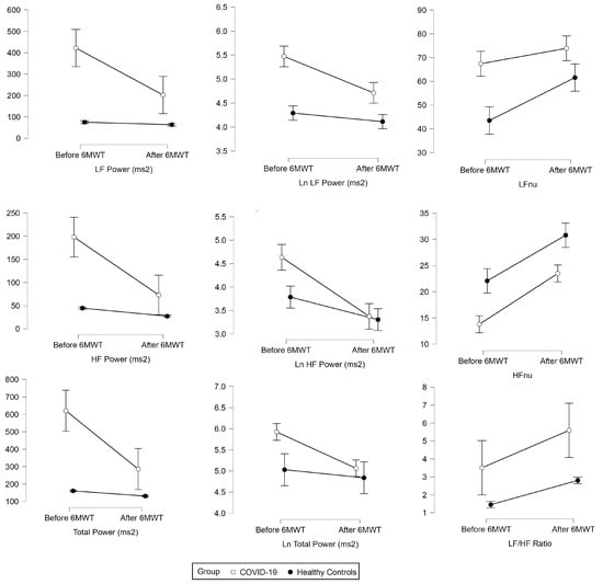 Total power (TP) reflects the body’s state of relaxation or stress, and our study revealed both a significant Time effect and Time x group interaction. We know that the value of TP increases when the body relaxes and decreases when it is under stress, and thus the decline in pre-post values after the incorporation of 6MWT was apparent. However, cytokine elements were already present in the bodies of the post-COVID-19 group, which may have contributed to the slow decline in TP values compared to the normal group. Similar results supporting this finding were conducted in a group of 12 COVID-19 patients and found that decreased HRV was associated with increased levels of inflammation, as measured by C-reactive protein (CRP) and interleukin-6 (IL-6) levels. The study suggests that HRV may be a useful tool as a predictive marker for acute inflammatory response in COVID-19 patients [9,31].
