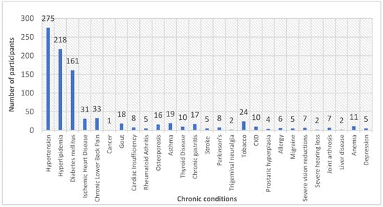 The mean number of chronic conditions among participants was 3. Hypertension (30.2%), hyperlipidemia (24.0%), and diabetes (18.0%) were the most reported chronic conditions among participants, followed by chronic lower back pain (3.6%), ischemic heart disease (3.4%) and tobacco use (2.6%). The details are presented in Figure 1. The number of chronic conditions was significantly associated with increasing age (p < 0.05). The details are presented in Table 2. The mean number of chronic conditions was statistically significantly higher among females (3.19 ± 0.89) than males (2.85 ± 0.78) (p < 0.05). Regarding the educational level, there was a significant decrease in the mean number of chronic diseases with increasing educational level; up to diploma level (p < 0.05) and a significant increase in the mean number of chronic diseases at the university level (3.03 ± 0.83) (p < 0.05).