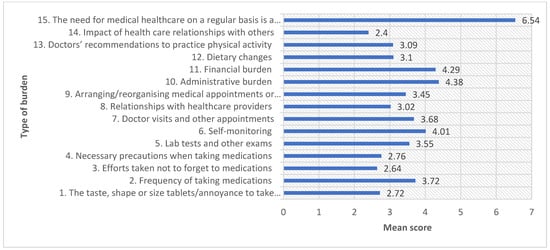 The TBQ-15 questionnaire had a possible score of 0–150. The mean score of the treatment burden for the participants was 53.4 (SD = 28.2), indicating an acceptable burden of treatment according to the Patient’s Acceptable Symptom State (PASS). Around 47.6% of participants scored a total score level above 59, denoting a high treatment burden level. Based on the TBQ-15 scores, the highest mean scores were obtained for aspects such as the need for medical healthcare on a regular basis as a reminder of health problems suffered (Q15) with a mean score of 6.54, administrative burden (Q10) with a mean score of 4.38 and a financial burden (Q11) with a mean score of 4.29. The details are presented in Figure 2. Meanwhile, the lowest mean scores were obtained for aspects such as the impact of healthcare relationships with others (Q14), with a mean score of 2.40, efforts taken not to forget the medication (Q3), with a mean score of 2.64 and the taste, shape, or size of tablets annoyance to take medication (Q1) with a mean score of 2.72. Around 58.4% of participants reported a very high treatment burden for Q15. When each of the domains of treatment burden was analyzed individually, the domains with the greatest level of burden were the social life burden (mean = 4.47, SD = 2.29), financial burden (mean = 4.29, SD = 3.26), and time and administrative and time burden (mean = 3.71, SD = 2.37).