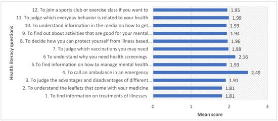 The HLS-SF12 questionnaire has a possible score of 0–60. The mean score of health literacy for the participants was 16.4 (SD = 12.6), indicating a limited health literacy level among participants. About three fourth of participants reported limited health literacy; meanwhile, only 2% of participants reported an excellent health literacy level. The mean score of participants’ responses to the HLS-SF12 questions, which ranged from 1 (very difficult) to 4 (very easy), is presented in Figure 3. Most participants responded that they experienced great difficulty (score 1) in finding information on treatments for illness (Q1), understanding leaflets that come with their medication (Q2), finding out about activities that are good for their mental well-being (Q9), and deciding how they can protect themselves from illness based on advice (Q8). When comparing health literacy based on the three areas of health literacy, healthcare, disease prevention, and health promotion, there was not much disparity observed between overall mean scores and gender-specific mean scores of each area of health literacy.