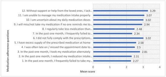 The MyMAAT questionnaire had a possible score between 12 to 60. The mean score of medication adherence for the participants was 32.6 (SD = 12.3), indicating medication non-adherence among participants. Of the total, 83.2% of participants were non-adherent to their medications. Most participants reported difficulty in aspects such as Q1, adhering to medications according to their doctor’s instructions (61.0%); Q2, reducing their medication intake whenever they felt better (57.8%); Q7, frequently failing to remember to take their medications (59.3%); and Q8, regularly taking fewer medications than prescribed due to fear of side effects (53.8%). The data are presented in Figure 4.