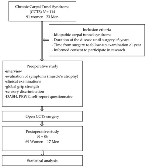 This study was performed on 114 patients diagnosed with chronic carpal tunnel syndrome (CCTS) who underwent surgery in the Traumatology, Orthopedics, and Hand Surgery Department Poznan University of Medical Sciences, Poland, from 2014 to 2018. The study was approved by the Bioethics Committee at the Poznan University of Medical Sciences (Resolution no. 32/15).