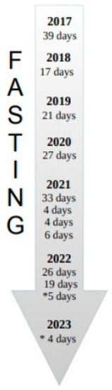 Fasting timeline of patient #1. He followed a strict fasting regime as follows: 39 days (2017), 17 days (2018), 21 days (2019), and 27 days (2020). In 2021, he fasted four times: 33, 4, 4, and 6 days, respectively. From 2022 to 2023, he fasted for a total of 9 days (*5 days in 2022 and *4 days in 2023, respectively).