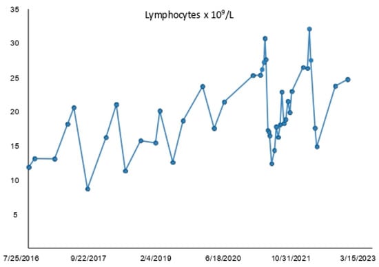 We monitored the absolute lymphocyte counts between 2016 and 2023, and we observed significant deep fluctuations of lymphocytosis during this period, as shown in Figure 2.