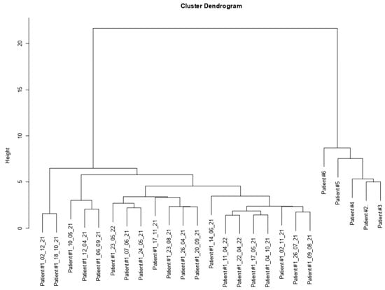 The results of hierarchical clustering are depicted using a tree-based representation known as a dendrogram in Figure 3. Patients #2, #3, #4, #5, and #6 clustered together, independently from patient #1.