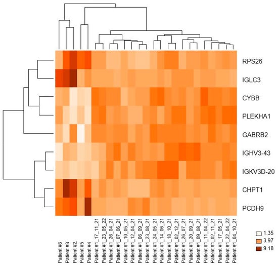 Differential expression analysis, revealed, after correction for multiple testing, 18 differentially expressed genes (DEGs) in the comparison between CD19+ cells of patient #1 and patients #2, #3, #4, #5, and #6. Among them, we focused on nine genes with functional annotation: four genes were downregulated (IGLC3, RPS26, CHPT1, and PCDH9), and five genes were upregulated (IGHV3-43, IGKV3D-20, PLEKHA1, CYBB, and GABRB2) in the 1st group (patient #1) vs. the 2nd group of patients (#2, #3, #4, #5, and #6 (Table 4). In particular, IGLC3, RPS26, PLEKHA1, CYBB, and GABRB2 exhibited a high fold change (FC) > 3. Among them, RPS26, CHPT1, CYBB, and GABRB2 were found to be associated with KEGG pathways, as shown in Table 5. Additionally, we generated a heat map on log2 expression of the nine differentially expressed genes across different patients/conditions (Figure 4). False discovery rate (FDR) (q-value) and FC values are provided in Table 4.