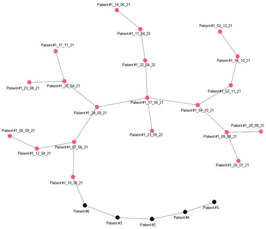 As explained in the methods, we also computed the Euclidean pair-wise distance between samples of patient #1 (during nutrition and fasting) and samples of patient #2, #3, #4, #5, and #6 (following a varied diet), using this distance as the weight. Consequently, we constructed a minimum spanning tree (MST) that displays, within the same graph, the subjects as colored nodes and the pairs of closest subjects connected by edges. Black and red dots represent the samples from the 2nd group and the 1st group, respectively (Figure 5). Once again, patients #2, #3, #4, #5, and #6 are closer to each other than to any other sample belonging to patient #1.