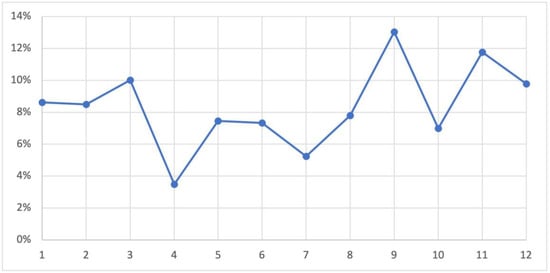 The temporal distribution of UTIs throughout the study duration was reported. September came with a higher prevalence of UTIs (13%) compared to other months, while in April, the lowest prevalence was recorded, as illustrated in Figure 2.