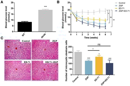 3.1. ZGP and ED-71 Synergistically Reduced Blood Glucose Levels in Diabetic Mice