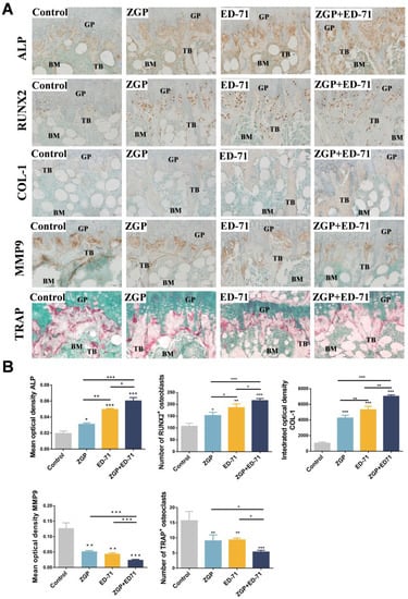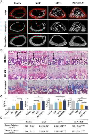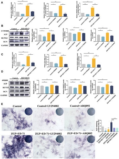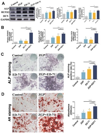 3.3. The ZGP and ED-71 Combination Promoted Osteogenic Differentiation of the MC3T3-E1 Cells