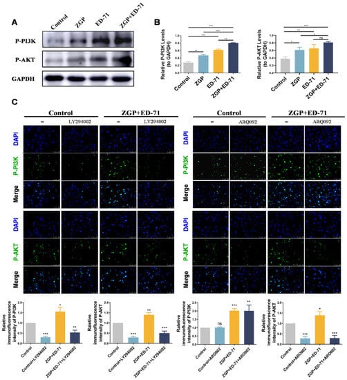 3.4. ZGP Synergized with ED-71 to Promote the Osteogenic Differentiation of MC3T3-E1 Cells through the PI3K–AKT Pathway