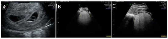 Ultrasound images of: (A) twin pregnancy; and (B,C) angiomyxoma.