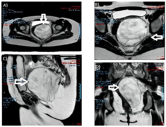 During the gynecological examination, a swelling of the left posterolateral vaginal wall with an antero-deviated portio was noted. The gynecologist performed further checks. Blood markers resulted negative. A protruding pelvic mass was described from the left perineal plane to the ischiorectal fossa on abdominal magnetic resonance imaging (MRI) (Figure 2), with dimensions of 10 × 10 × 11 cm and cottony content, hyperintense in T2, without a restriction of diffusivity. The neoformation compressed and contralaterally displaced the levator ani muscle and the wall of the rectum, anteriorly the bladder and the vaginal canal, with a cranial dislocation of the uterus. There were no appreciable signs of the infiltration of contiguous structures and no fluid flaps or lymphadenopathies. The growth and description were suggestive of an angiomyxoma.