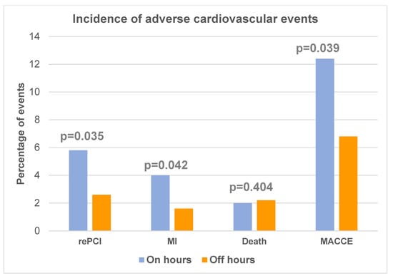 The mean follow-up was 30 months ± 7 months. During follow-up, 1216 patients were monitored. Adverse cardiovascular events defined as MACCE—any death, MI, CVA, repeated PCI, or coronary bypass grafting (CABG) were more frequent in the on-hours group mostly due to the notable difference in the rate of repeated PCI in patients admitted during working hours. Major adverse cardiovascular events are shown in Table 4.