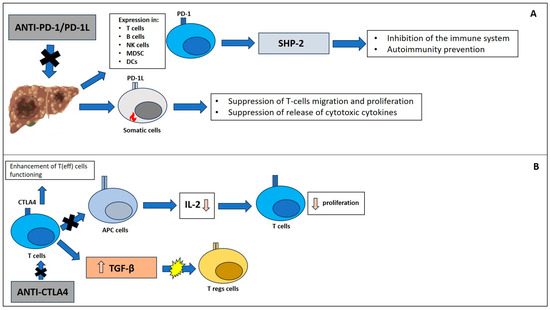 HCC appeared to be a good environment for immune checkpoint inhibitors (ICIs) treatment due to the high intrahepatic lymphocyte expression of PD-1 in chronic liver diseases. In detail, these diseases are associated with a greater expression of PD-1L in Kupffer cells [44]. In further detail, PD-1 is a receptor expressed on activated T cells, B cells, NK cells, MDSC, and DCs. Mainly, it can inhibit the immune system via tyrosine phosphatase SHP-2, preventing autoimmunity [45]. The ligand is PD-L1, which is expressed by somatic cells in a pro-inflammatory setup; it also suppresses T-cell migration, proliferation, and the release of cytotoxic cytokines (Figure 1A) [46]. Therefore, it is of extreme importance for signaling in liver tumors: It is driven by cancer cells, which constantly express PD-L1 and consequently activate PD-1 in tumor-infiltrating lymphocytes (TILs), evading immune surveillance [47]. Interesting, several studies demonstrated the association between high expression of PD-L1 in liver cancer cells and poor prognosis in HCC [48,49]. The latter was mainly due to tumor recurrence aggressiveness [50,51].