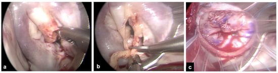 The right mini-thoracotomy approach, perfusion strategies, and aortic clamping techniques used for patients undergoing MV surgery have been described previously [12,13,14]. Briefly, a right anterolateral mini-thoracotomy in the fourth intercostal space is performed, and double lumen endotracheal tube intubation for the single left lung ventilation is provided in all patients. More posteriorly, a secondary port is prepared for the endoscope and for carbon dioxide insufflation. An additional sixth intercostal space port is created for pump suction. After the institution of cardiopulmonary bypass, the core temperature is lowered to 30 °C. Arterial perfusion is gained with peripheral femoral or axillary cannulation. The latter is usually preferred to provide antegrade systemic perfusion in the case of severe atherosclerotic burden [12]. Venous drainage is obtained via double femoral and jugular cannulation. All cannulae are inserted with a Seldinger technique, either under direct vision in case of vascular surgical exposure or percutaneously. The ascending aorta is clamped using the endoaortic balloon or a trans-thoracic clamp. In the endoaortic clamping setting, aortic occlusion and cardioplegia delivery are gained with a balloon catheter inserted into the sidearm of a femoral arterial cannula (21F or 23F Intraclude, Edwards Lifesciences, Irvine, CA, USA). In the trans-thoracic clamping setting, the clamp is addressed towards the ascending aorta using the first intercostal space with a Chitwood clamp or the main port with a Cygnet flexible clamp. Cardioplegia is delivered with a 7F cardioplegia needle (CalMed Technologies, Santa Inez, CA, USA) placed into the proximal ascending aorta. Antegrade myocardial protection is provided with St. Thomas (Plegisol, Hospira Inc., Lake Forest, IL, USA) or Custodiol (Bretschneider histidine, tryptophan, ketoglutarate solution, Kohler Chemie, Bensheim, Germany) cold crystalloid cardioplegia [13]. Superior and inferior vena cava snaring is obtained by placing tourniquets around the vessels or by placing endovascular balloons to provide a temporary mini right atriotomy to drain the cardioplegic solution and in patients requiring associated right atrial procedures, most commonly tricuspid valve repair. The MV is exposed via a standard left atriotomy parallel and posterior to the interatrial septum (Figure 1). The extension of vegetation, leaflet involvement, and the chances of valve repair are assessed. Clamp release is obtained at a core temperature above 33 °C during rewarming. Intraoperative transesophageal echocardiography is mandatory and was used in all patients to guide the correct positioning of the cannulae before the onset of cardiopulmonary bypass and to assess cardiac function, residual MV regurgitation in case of MV repair, paravalvular leaks, and prosthetic valve gradients after the intracardiac phase of the operation.