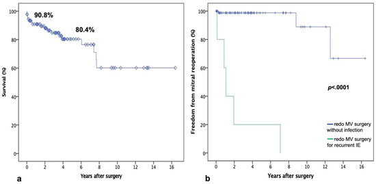 (a) Kaplan–Meier curve of survival probability. (b) Freedom from MV reoperation according to diagnosis.