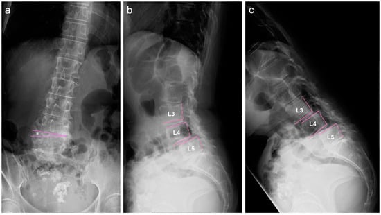 A standing lumbar radiograph in the antero-posterior view showed a coronal imbalance of the lumbar spine with L4 coronal tilt (12°) (Figure 1a). Lateral lumbar radiography revealed spondylolistheses at L3 and L4 (Figure 1b). A forward-bending radiograph showed an increase in anterior slipping of the L3 and L4 vertebrae (Figure 1c). A T2-weighted image (T2-WI) of sagittal lumbar magnetic resonance imaging (MRI) demonstrated narrowing of the lumbar canal at the L3/L4 and L4/L5 disc levels (Figure 2a). Axial lumbar MRI (T2-WI) showed definite stenosis (Grade C by Schizas’s grading []) narrowed by a disc bulge and thickened ligamentum flavum at the corresponding levels (Figure 2b,c).