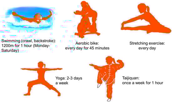 The patient completed the following daily physical exercises focusing on training the deep trunk muscles and stretching the lumbar ligaments (Figure 4). (1) Swimming (crawl and backstroke) 1200 m (M) from Monday to Saturday; (2) aerobic bike: 45 min every day; (3) stretching exercise: everyday; (4) yoga: 2–3 days a week; (5) Taijiquan; once a week for one hour.