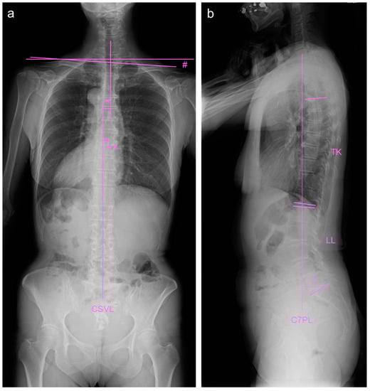 Standing whole-spine radiographs at baseline. (a) Antero-posterior whole-spine radiograph. # indicates clavicle angle, * indicates C7-CSVL measurement, and ** indicates apex-CSVL measurement. (b) Lateral whole-spine radiograph. C7PL: C7 plum line, TK: thoracic kyphosis, LL: lumbar lordosis, sagittal vertical axis: SVA. § indicates sagittal vertical axis (SVA).