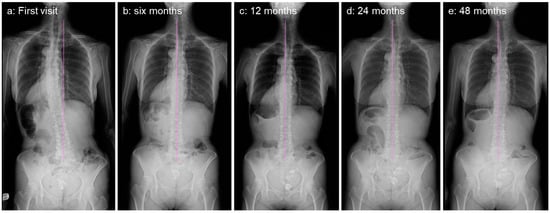 Standing antero-posterior whole-spine radiographs at first visit (a), 6 months (b), 12 months (c), 24 months (d), and 48 months (e). Straight vertical line indicates CSVL.