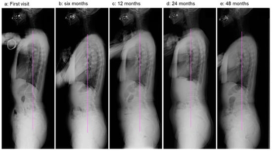 Standing lateral whole-spine radiographs at first visit (a), 6 months (b), 12 months (c), 24 months (d), and 48 months (e). Straight vertical line indicates C7PL.