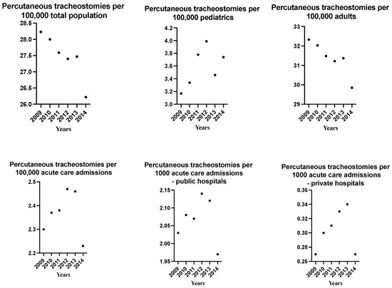Figure 1 showed the incidence of PT over the years. The rates of PTs were statistically different over the years (p < 0.001). PTs for 100,000 pediatric patients peaked in 2012. PTs for 100,000 adult patients slightly decreased over time. PTs per 1000 acute care admissions peaked in 2012. Surgical tracheostomy remained stable over time in pediatric and adult patients and per 1000 ICU admission (see Table S2).