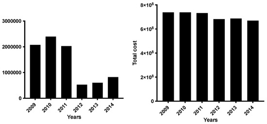 Table 2 showed the LOS of patients receiving PTs. PTs had a duration of hospital stay of 43 days in 2009 that decreased to 41 days in 2014 with statistical significance, even though the total duration of stay decreased over the considered years (p < 2 × 10−16).