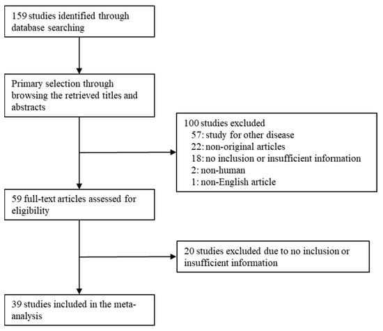 Database search was performed using the above-mentioned keywords. One hundred fifty-nine reports were identified in the database search. Articles were selected by screening the titles and abstracts. During the screening and full-text review, 38 articles were excluded because of insufficient information. In addition, 57 articles were excluded because they focused on other diseases. The remaining 25 articles were excluded because they were non-original (n = 22), used animals or cell lines (n = 2), or were not written in English (n = 1). Finally, 39 articles were included in the meta-analysis (Figure 1 and Table 1).