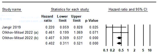 The GATA3 IHC expression rate was 0.748 (95% confidence interval [CI]: 0.704−0.787) in all cases (Table 2). The expression rates of GATA3 in the urinary bladder and urinary tract were 0.775 (95% CI: 0.727−0.818) and 0.614 (95% CI: 0.426−0.774), respectively. The GATA3 expression rate in UC was significantly higher in the urinary bladder than in the urinary tract (p = 0.001 in the meta-regression test). In the subgroup analysis based on study location, GATA3 expression rates were 0.741 (95% CI: 0.627−0.829), 0.748 (95% CI: 0.590−0.859), 0.775 (95% CI: 0.723−0.819), and 0.909 (95% CI: 0.561−0.987) in the American, Asian, European, and Oceania subgroups, respectively. The GATA3 expression rates in noninvasive and invasive UC were 0.965 (95% CI: 0.938−0.980) and 0.644 (95% CI: 0.581−0.702), respectively (Table 3). The GATA3 expression rate in carcinoma in situ was 0.956 (95% CI 0.878−0.985). GATA3 expression was significantly lower in muscle-invasive UC than in non-muscle-invasive UC (0.753, 95% CI: 0.645−0.836 vs. 0.937, 95% CI: 0.883−0.967; p = 0.041 in the meta-regression test). In a subgroup analysis based on histological subtypes, clear cell, microcystic, and pleomorphic adenocarcinoma subtypes showed GATA3 expression of more than 90%. The lymph node metastasis rate was not significantly different between GATA3-positive and -negative UCs (0.375, 95% CI: 0.282−0.478 vs. 0.340, 95% CI: 0.239−0.459). We evaluated the prognostic implications of GATA3 expression in UC. UC patients with GATA3 expression had better overall survival than those without GATA3 expression (hazard ratio 0.402, 95% CI: 0.311−0.521; Figure 2). However, there was no significant correlation between GATA3 expression and overall survival in UCs with genetically unstable luminal type.
