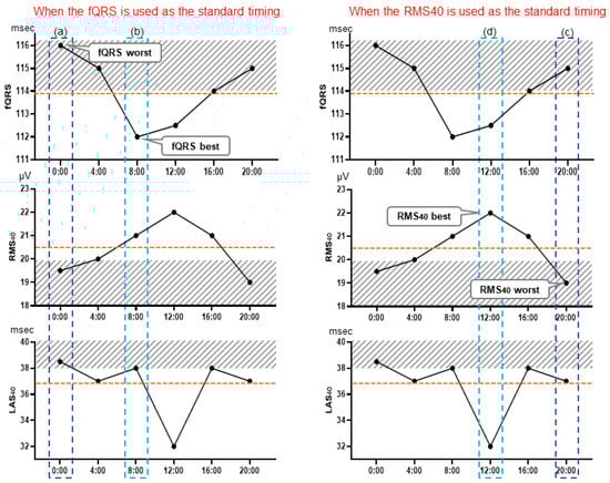 Recently, Holter electrocardiography (ECG) has also been used to measure LPs [6], and reports have emerged on the usefulness of Holter-based LPs for predicting SCD/lethal arrhythmia in patients with organic heart disease and chronic kidney disease [7,8,9]. Holter-based LP measurement is expected to become a mainstream test because it is performed simultaneously with routine Holter ECG, saving time for both patients and medical professionals compared to the conventional real-time LP measurement method. However, Holter-based LPs exhibit diurnal variation in post-MI patients [8], patients with Brugada syndrome [10,11], and healthy participants [12]. Given that 24 consecutive hours of LP data are obtained from Holter electrocardiographs, it is important to determine which method of LP data collection is most useful for stratifying patients by SCD/lethal arrhythmia risk. In previous studies, LP parameters, such as filtered QRS duration (fQRS) and the root mean square voltage of the terminal 40 ms in the filtered QRS complex (RMS40) captured at the time of the most abnormal or worst (lowest) RMS40 in 24 h [8,9,13] or the most abnormal or worst (highest) fQRS in 24 h [14], were used as representative Holter-based LP values. However, the timing of collecting SAECG testing data yielding LP parameters most useful for predicting lethal arrhythmias under ordinary daily conditions has not been completely validated. Moreover, factors influencing the diurnal variation in LP parameters are not completely understood in patients with post-MI status.